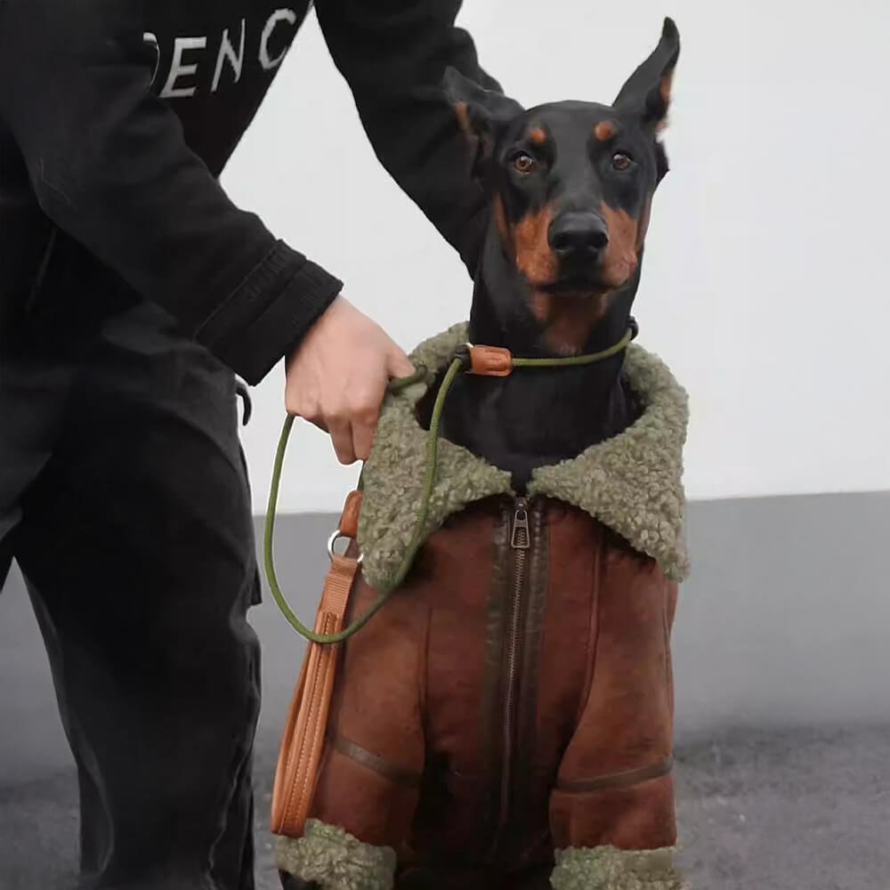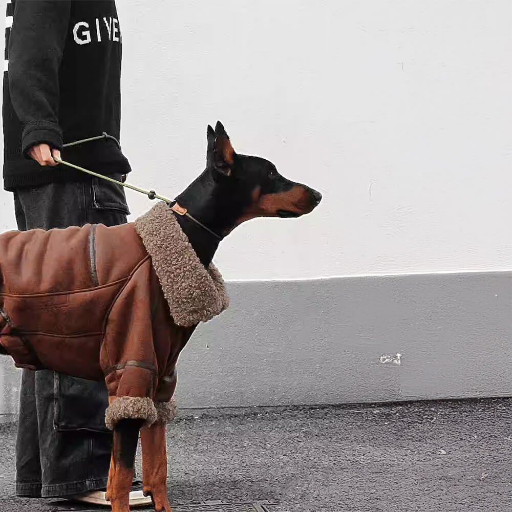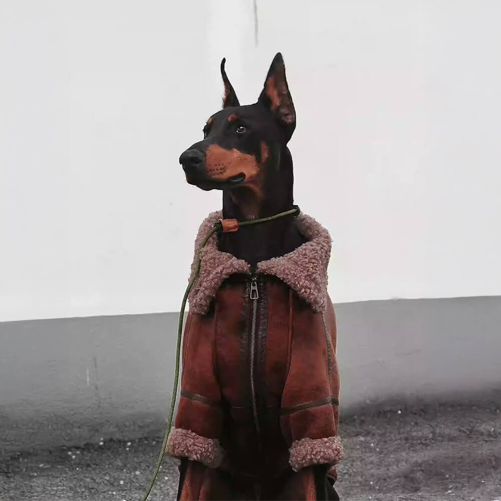Keep your dog warm and looking stylish with this vintage-inspired aviator jacket. Designed with a classic brown leather-look exterior and soft shearling lining, this coat is perfect for winter weather. The cozy shearling collar and cuffs provide extra warmth, while the stylish design gives your dog a fashionable edge. Ideal for large breeds, this jacket is both functional and trendy.